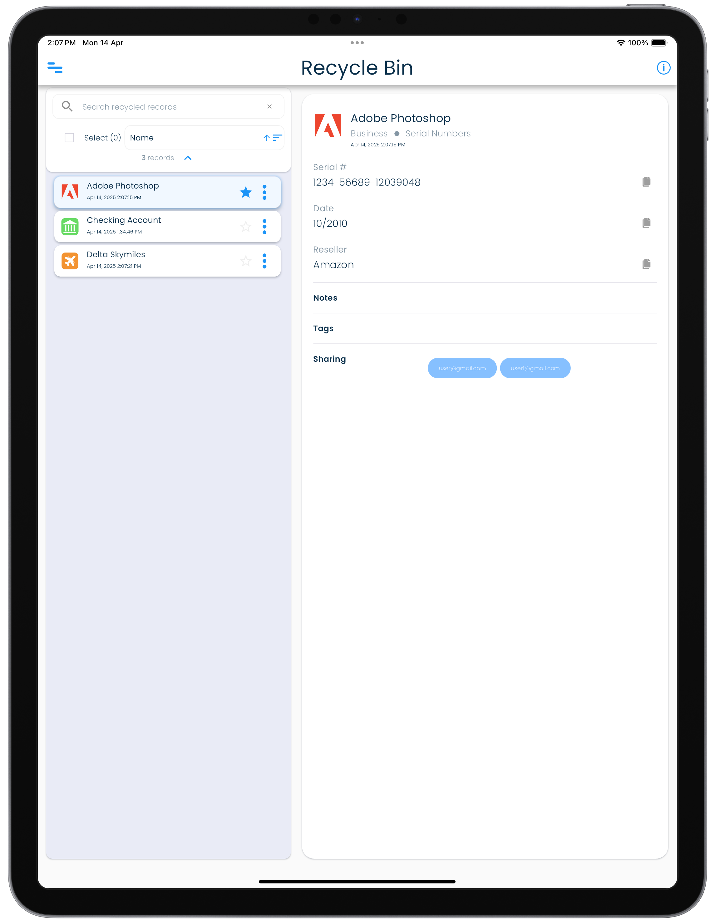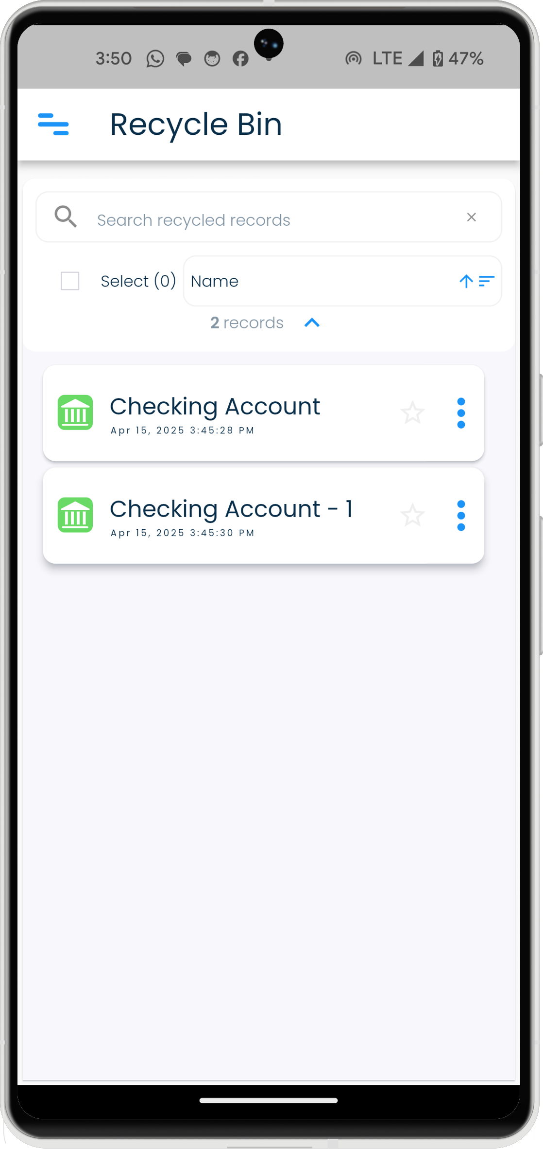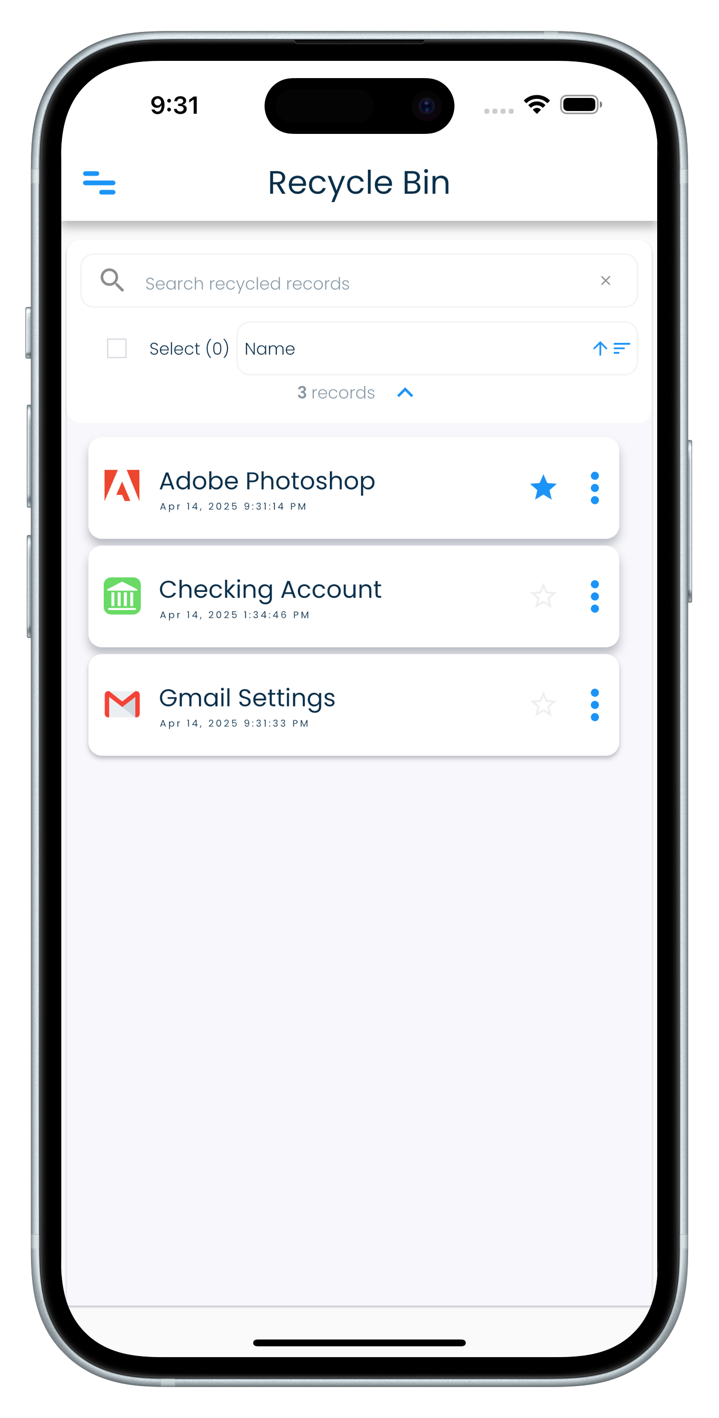 - Select a record in the record list in the Recycle Bin view.