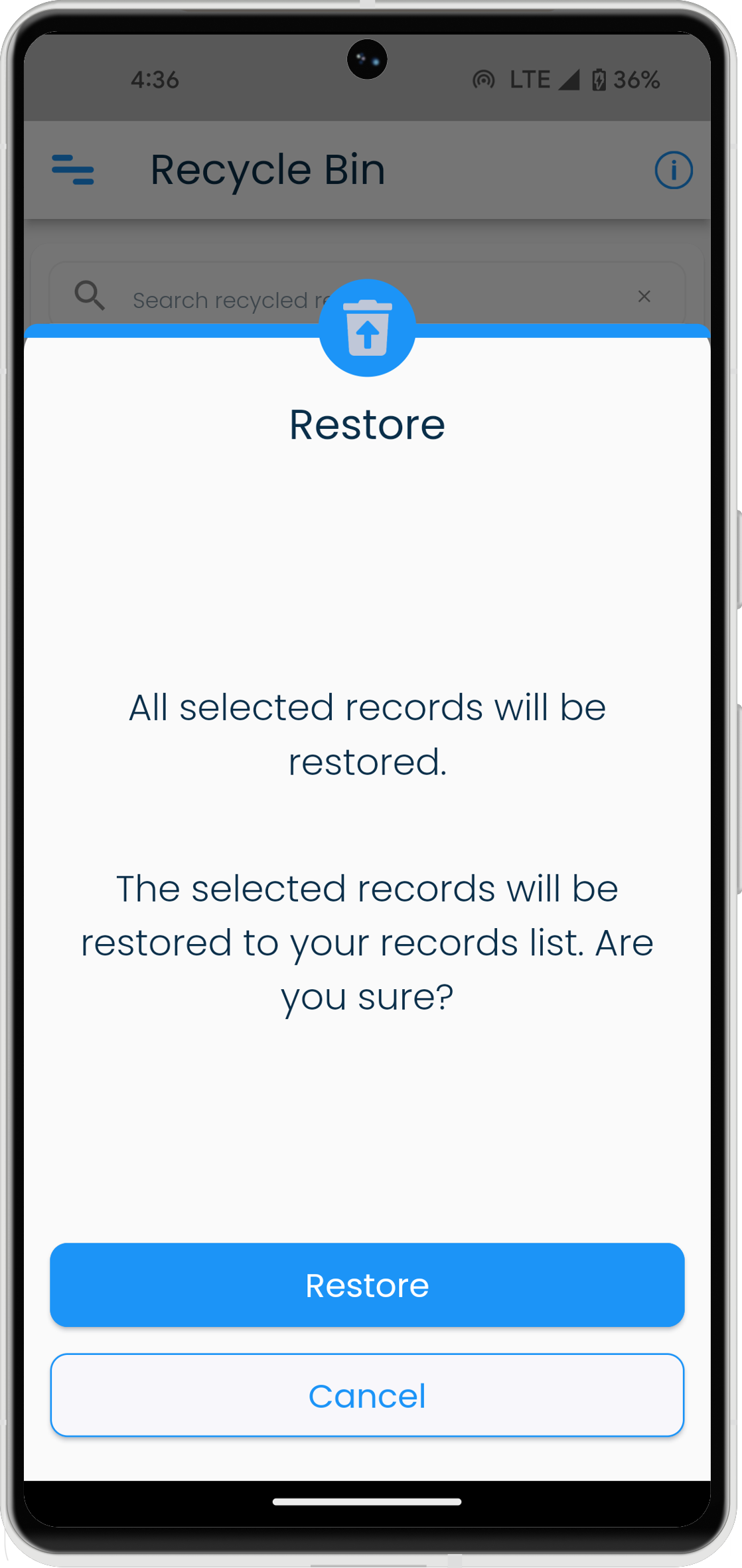 - Confirm by clicking or tapping on the Restore button to proceed with restoring the selected records.