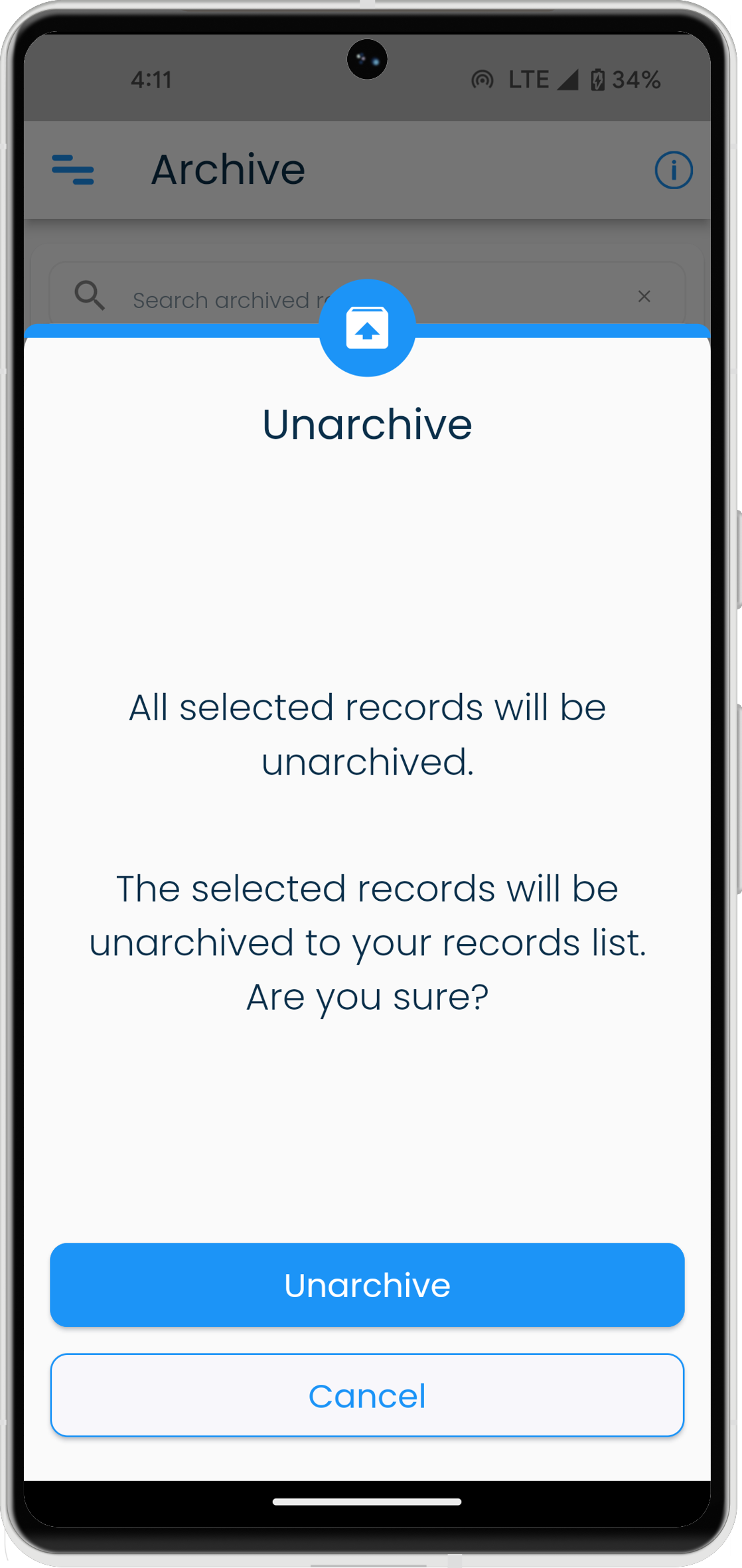 - Confirm by clicking or tapping on the Unarchive button to proceed with archiving the record.