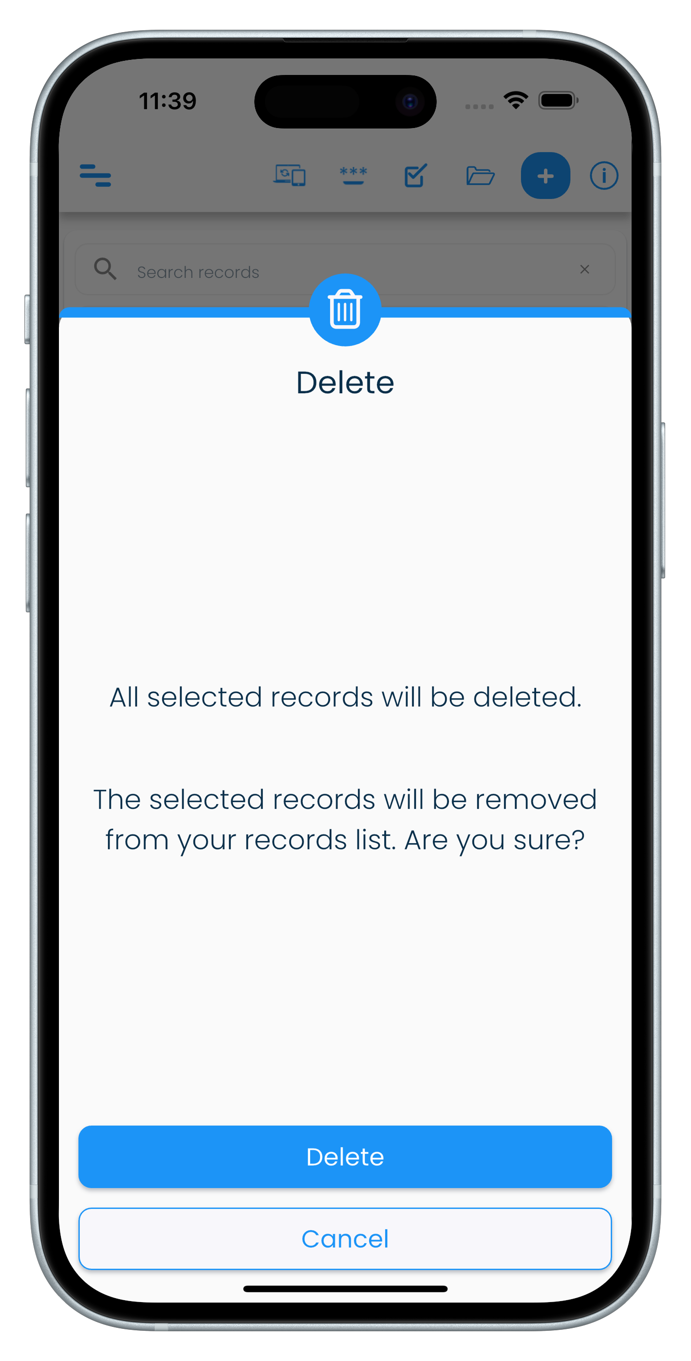 - Confirm by clicking or tapping on the Delete button to proceed with deleting the selected records.