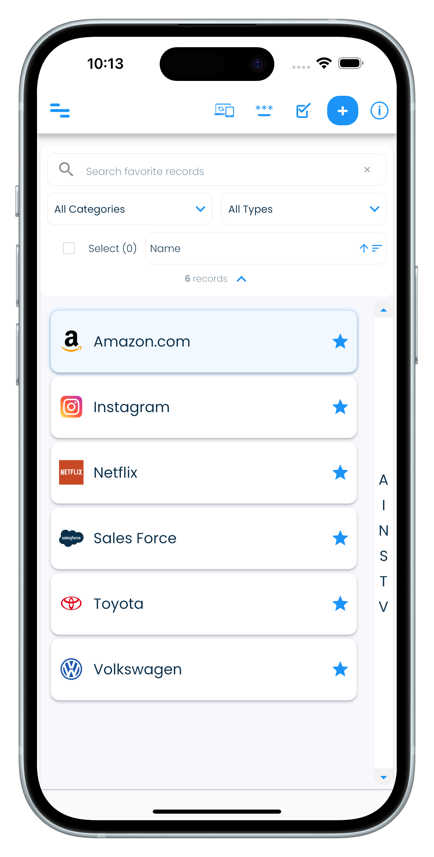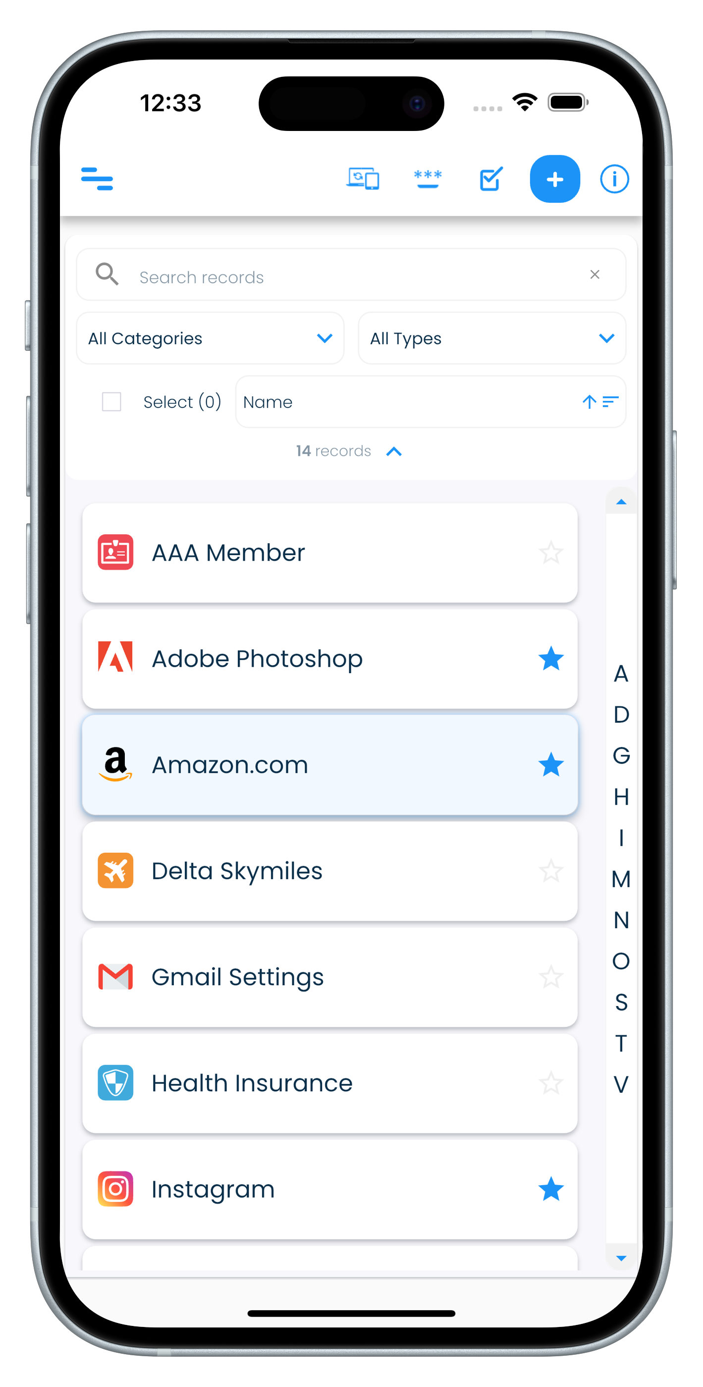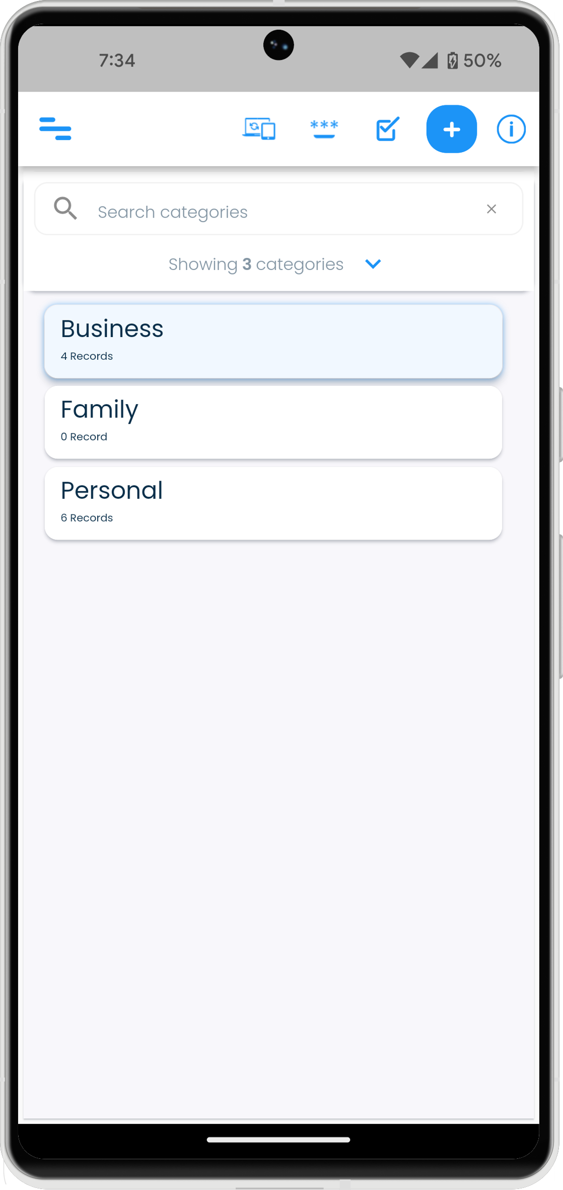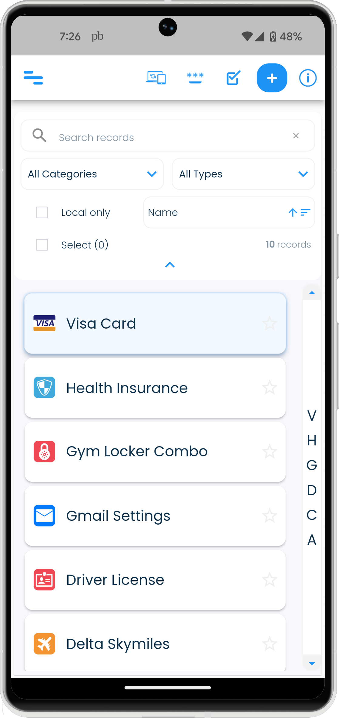 When you unlock the application on your device, you will be taken to the screen that shows all your records by default. You can search, filter or sort them to see them in the way that suits you.