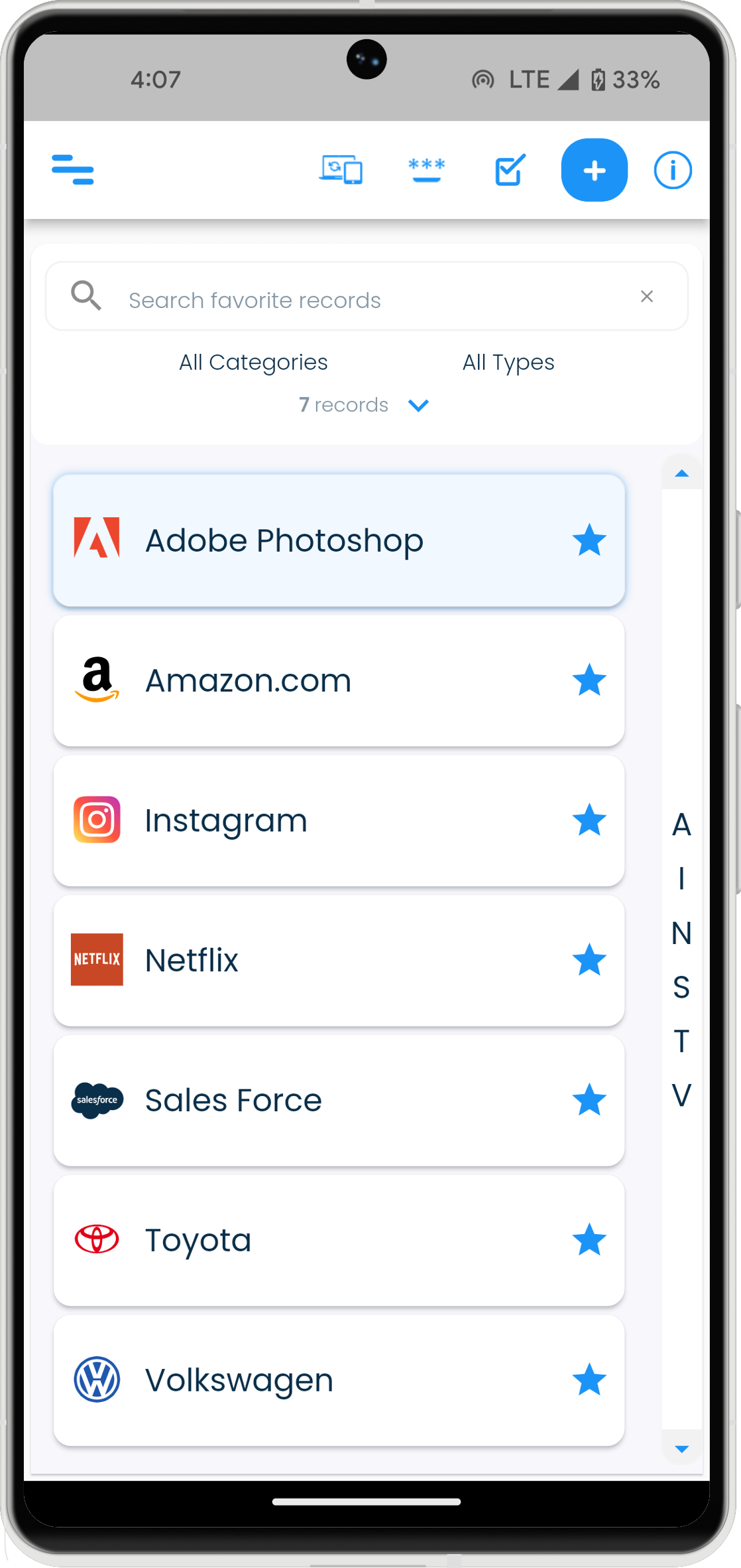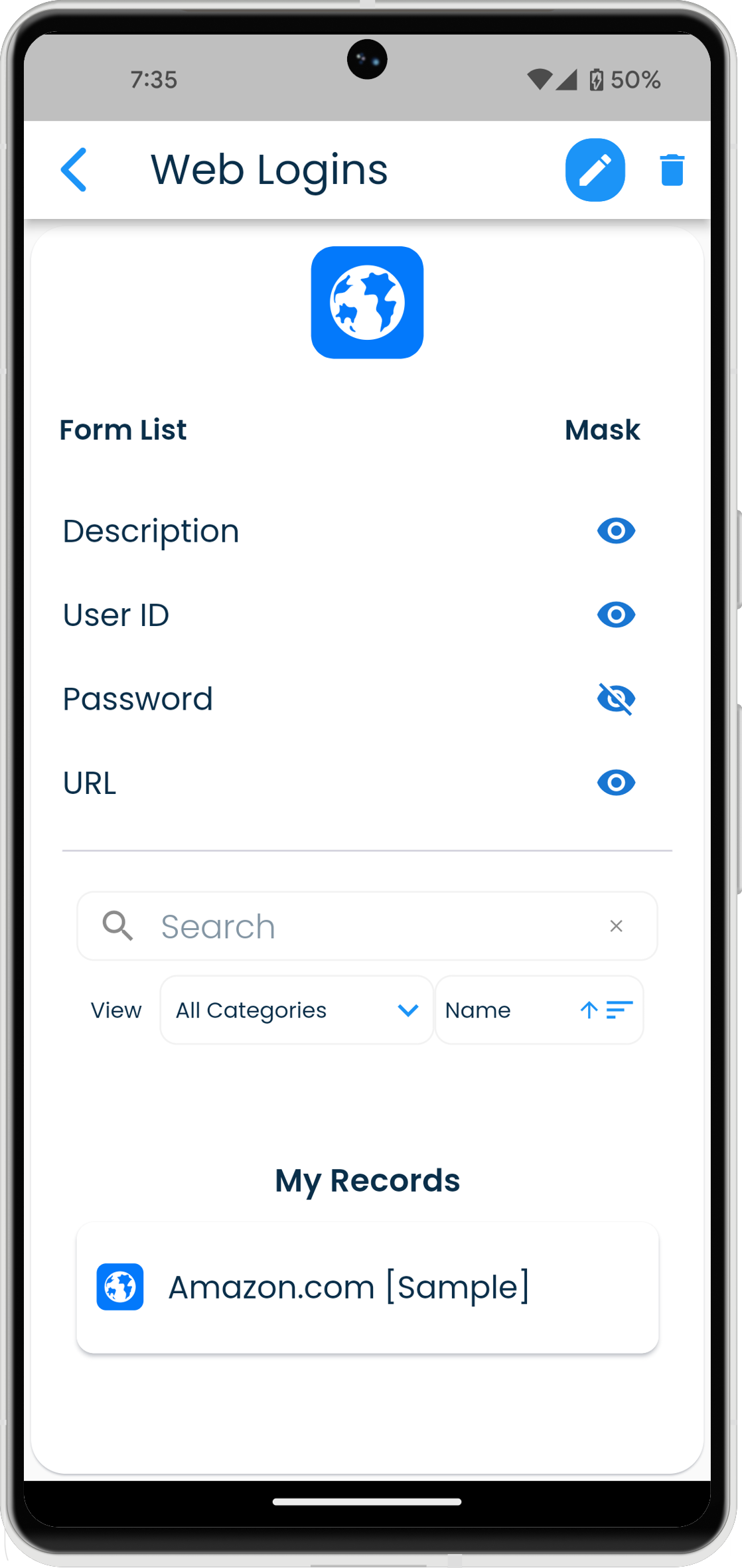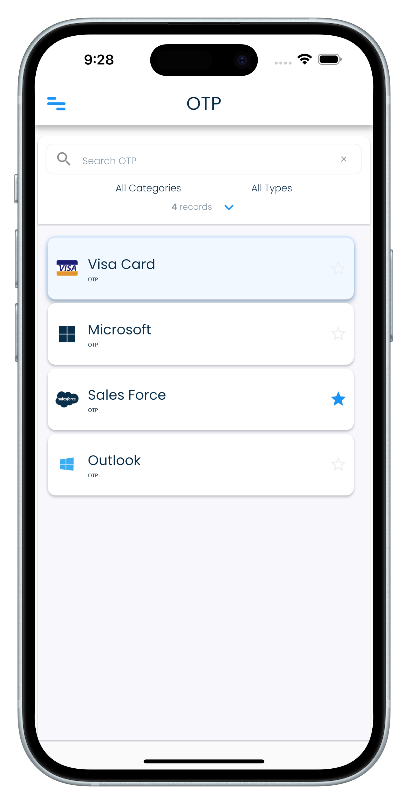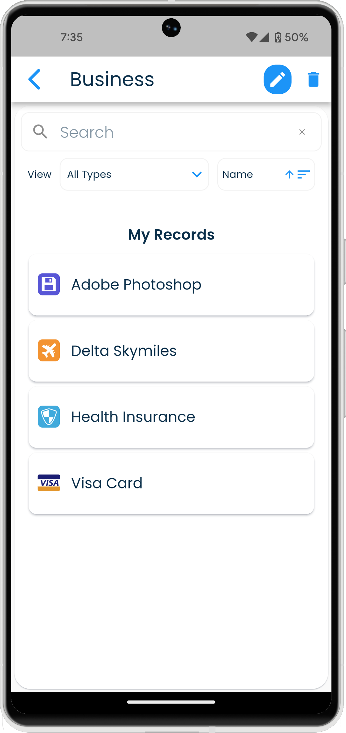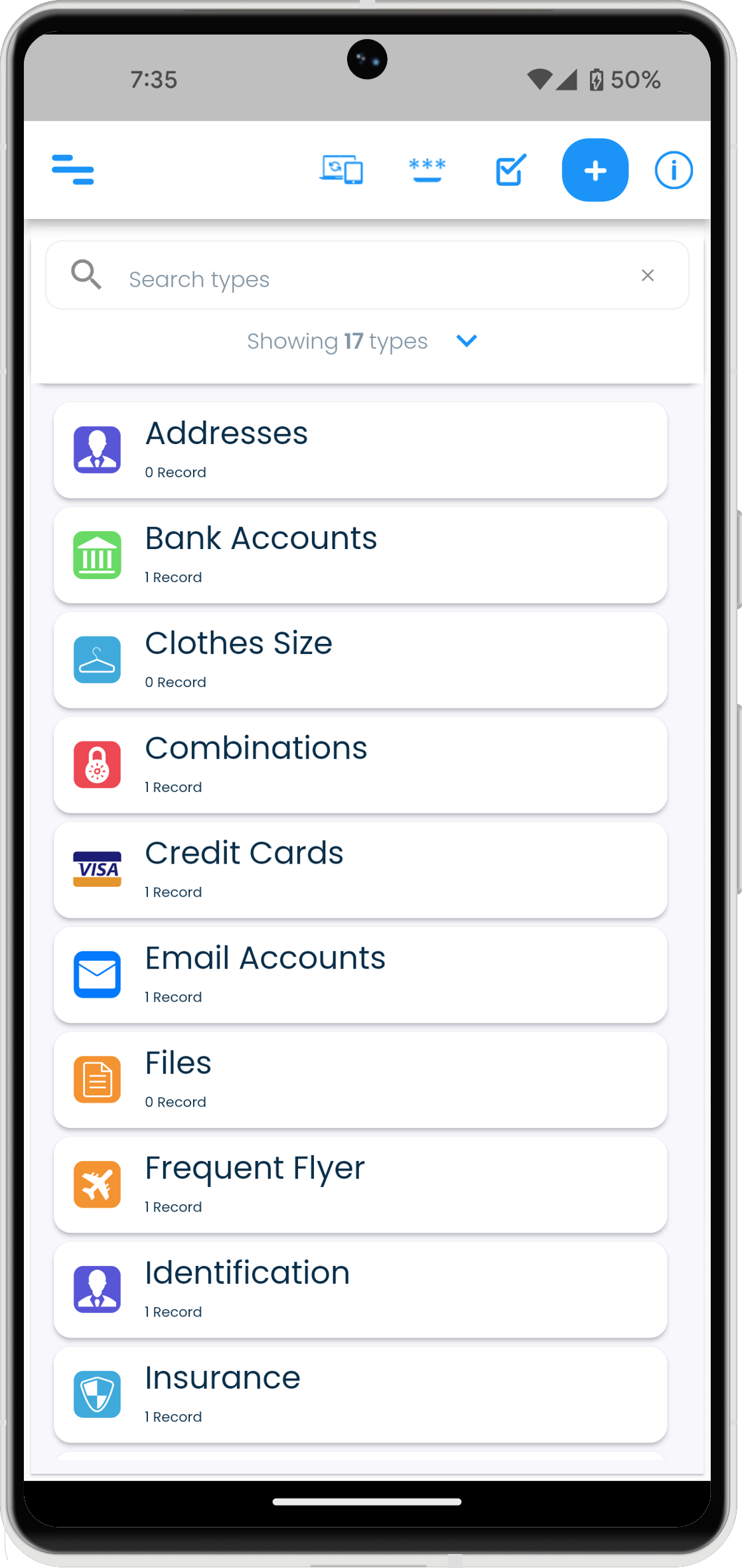When you unlock the application on your device, you will be taken to the screen that shows all your records by default. You can search, filter or sort them to see them in the way that suits you.