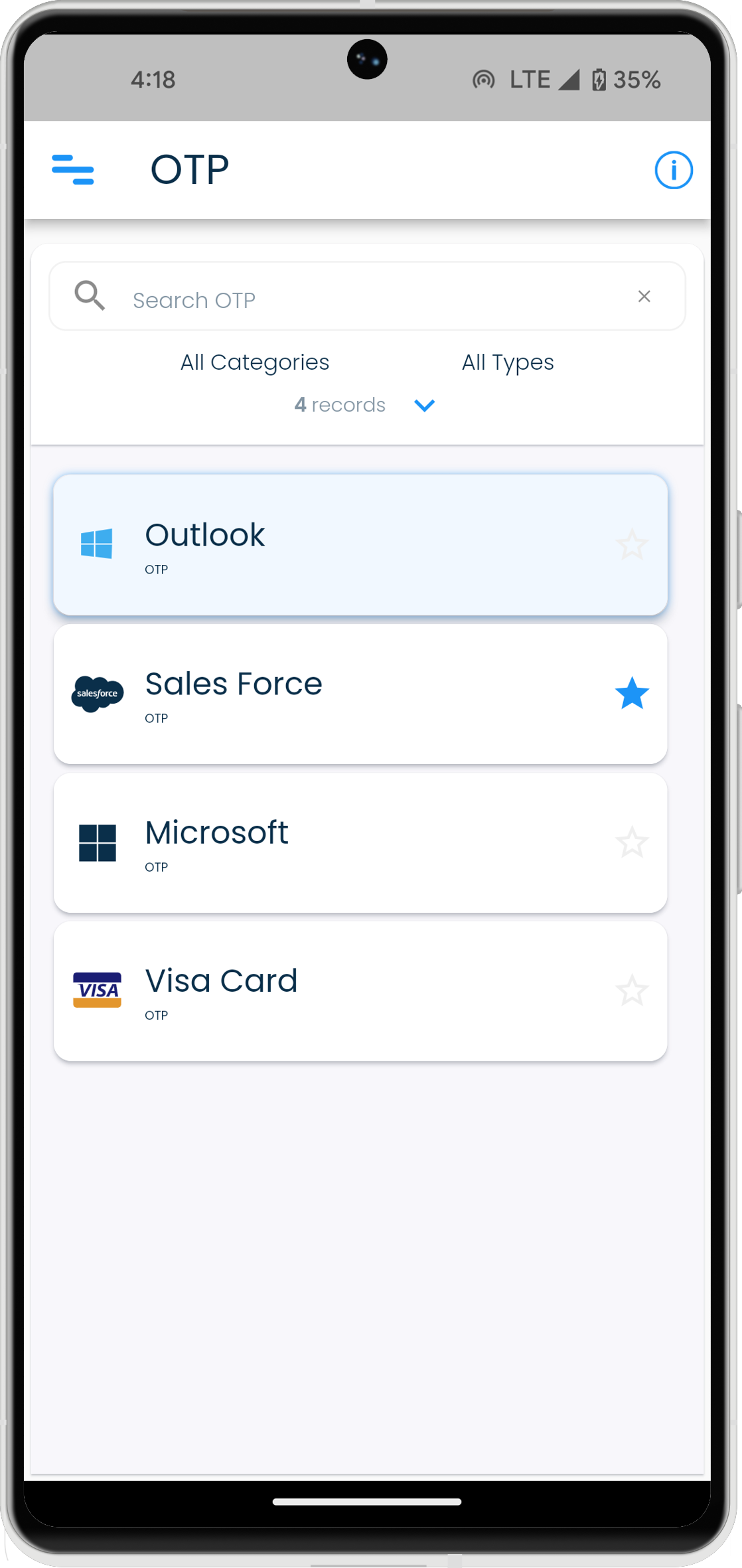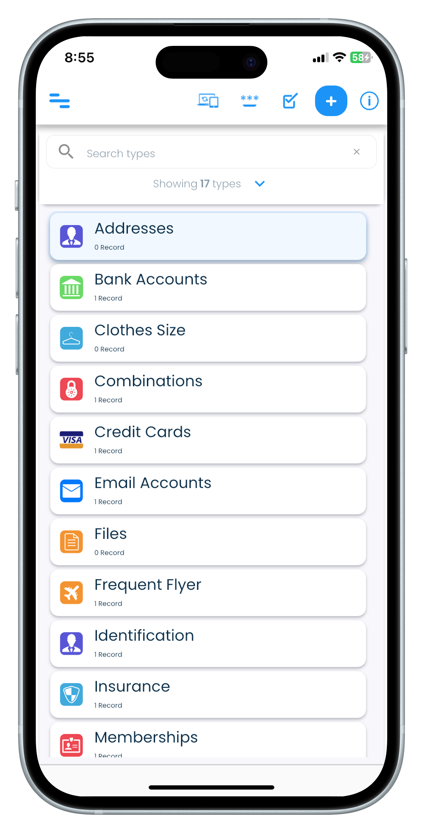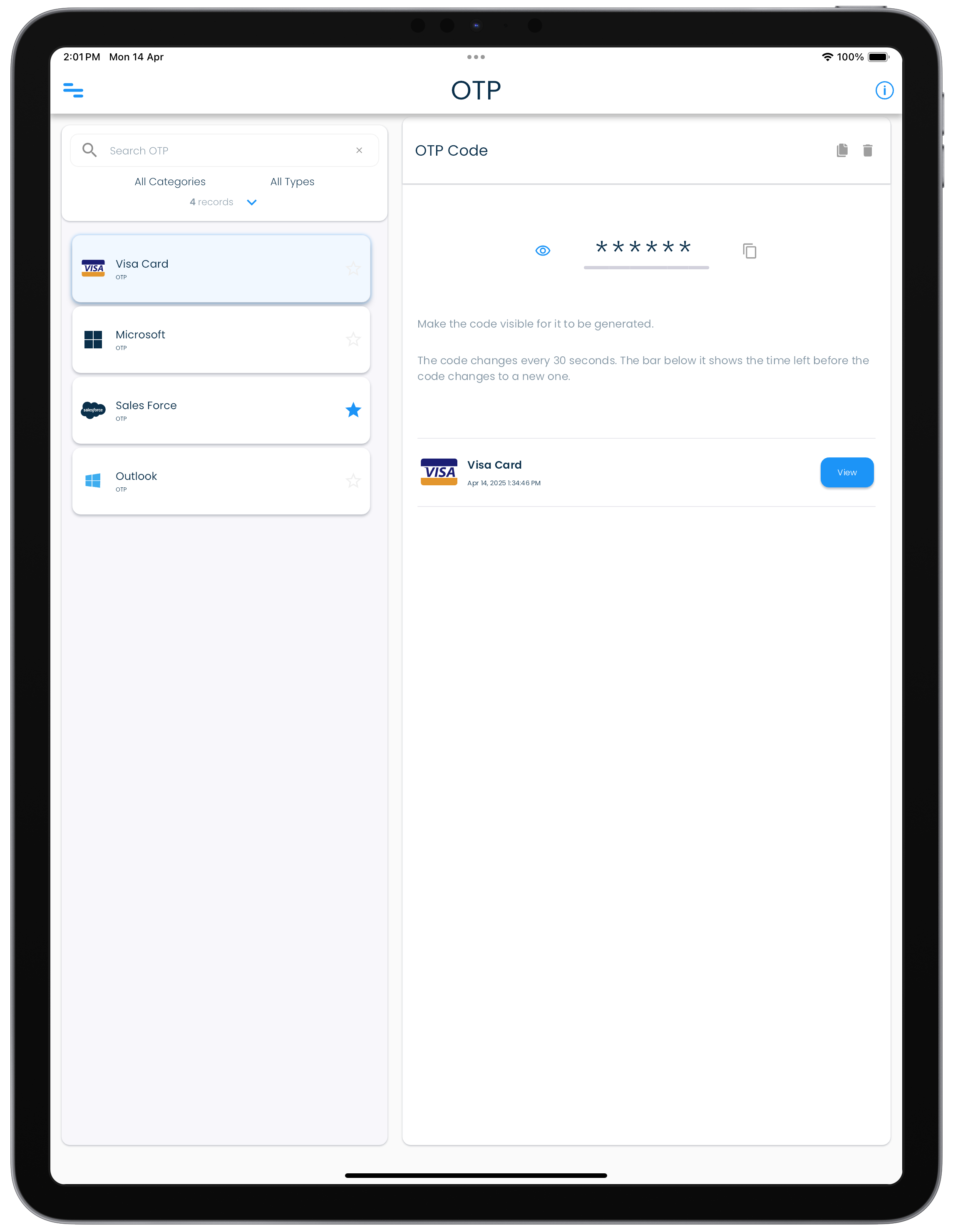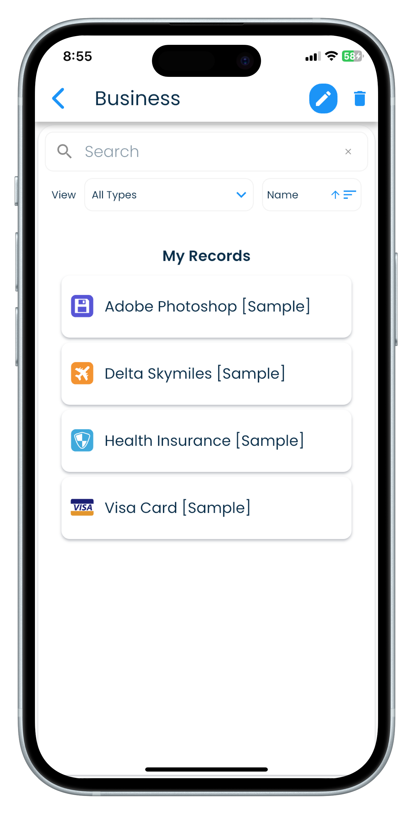 When you unlock the application on your device, you will be taken to the screen that shows all your records by default. You can search, filter or sort them to see them in the way that suits you.
