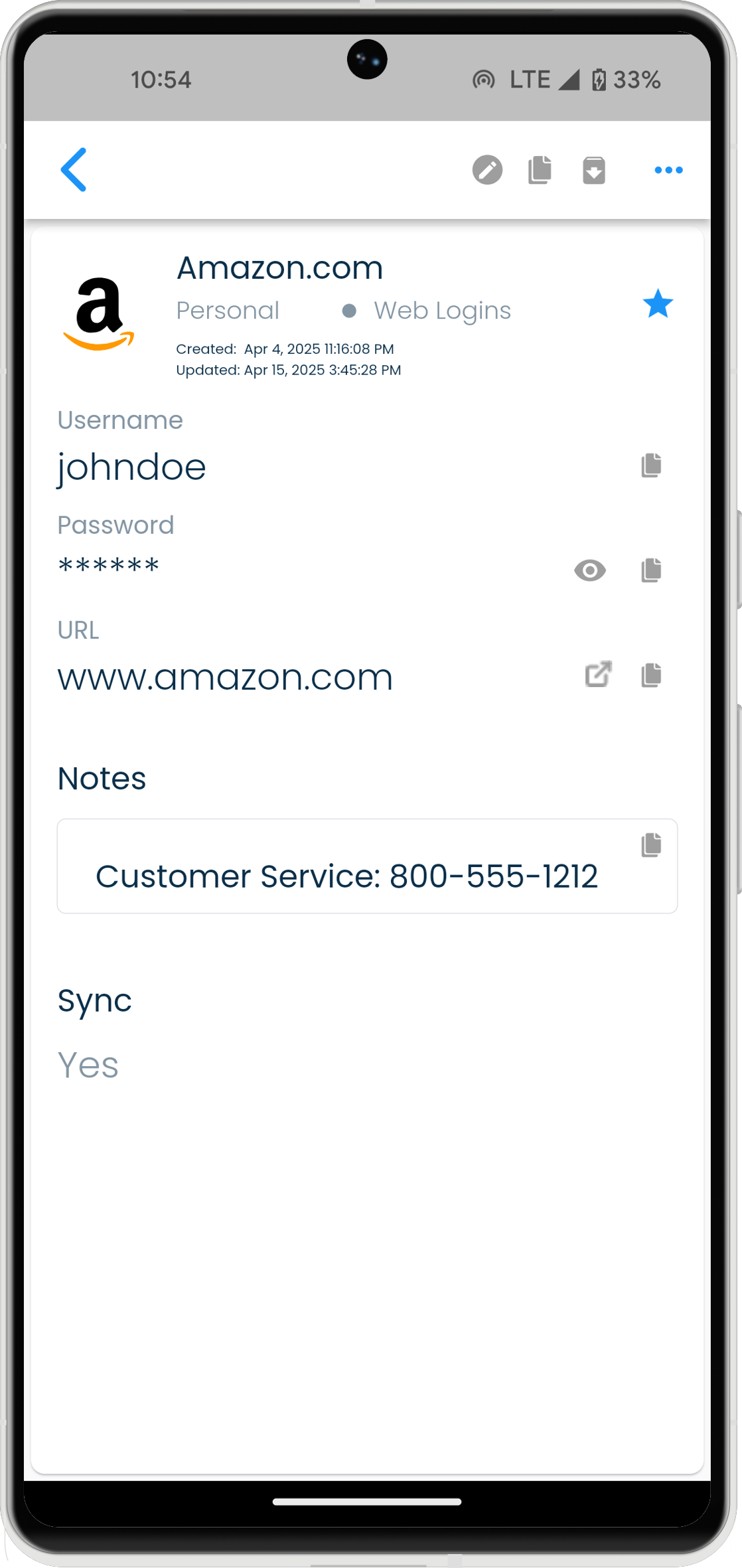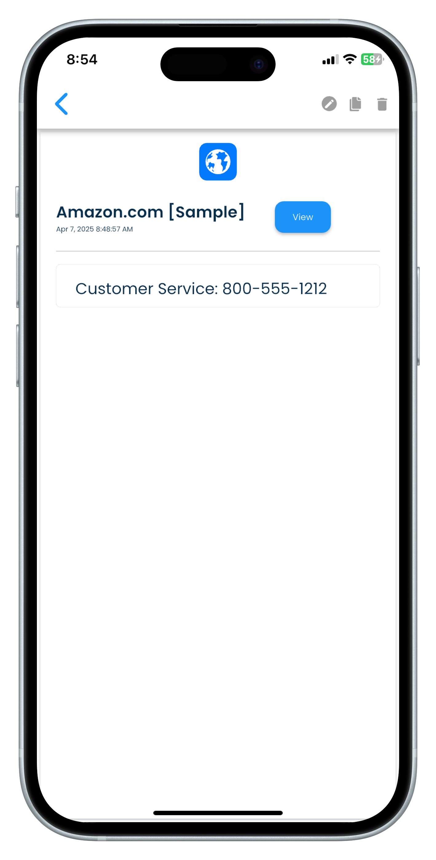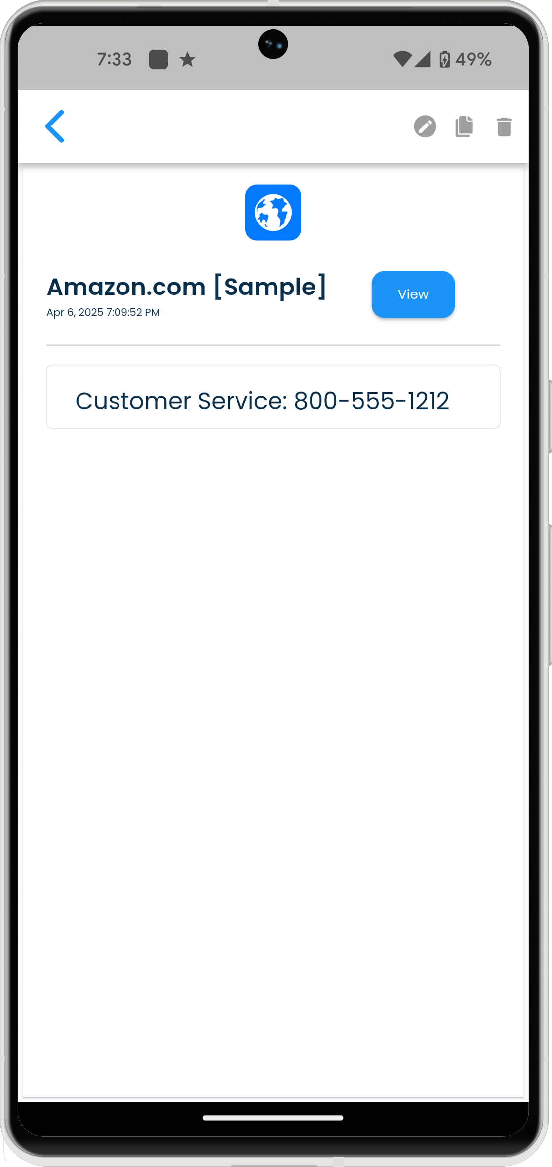 Most of the record fields will have a copy to clipboard button that is displayed to the right of the field when the record is being viewed. Click or tap on the copy to clipboard button to copy the field content to the clipboard on the device.