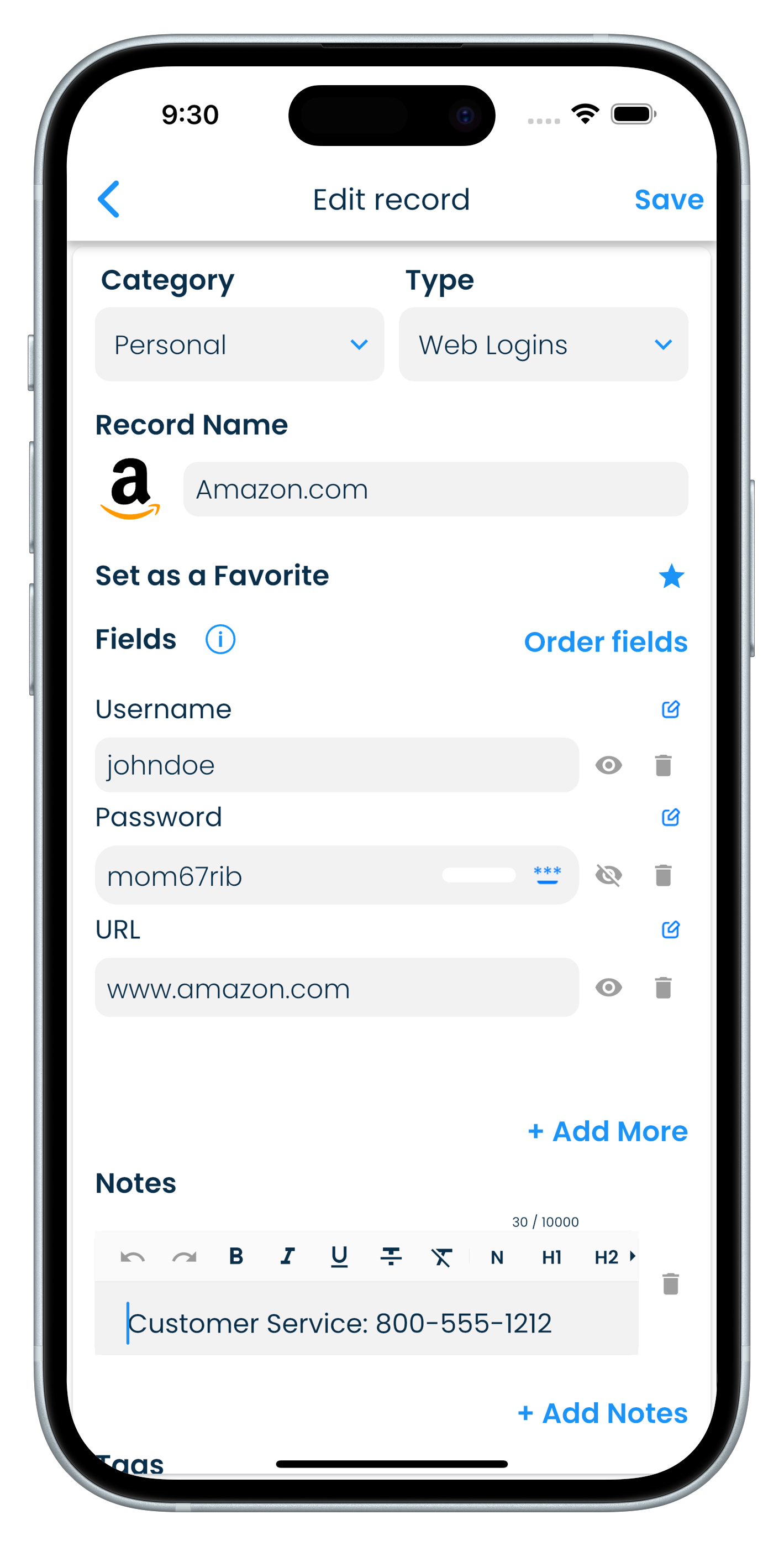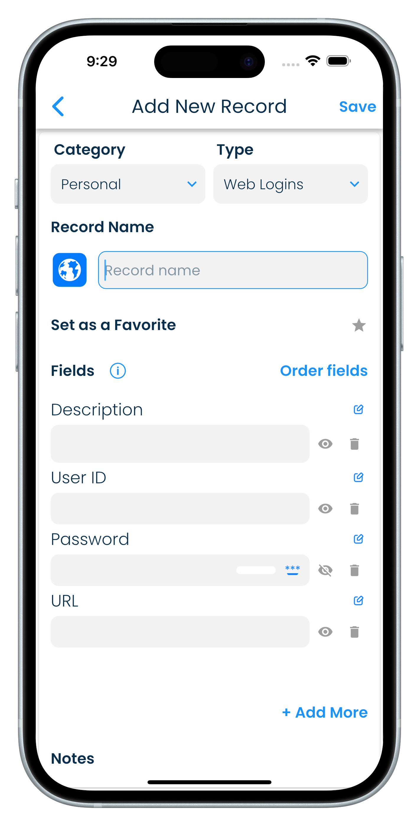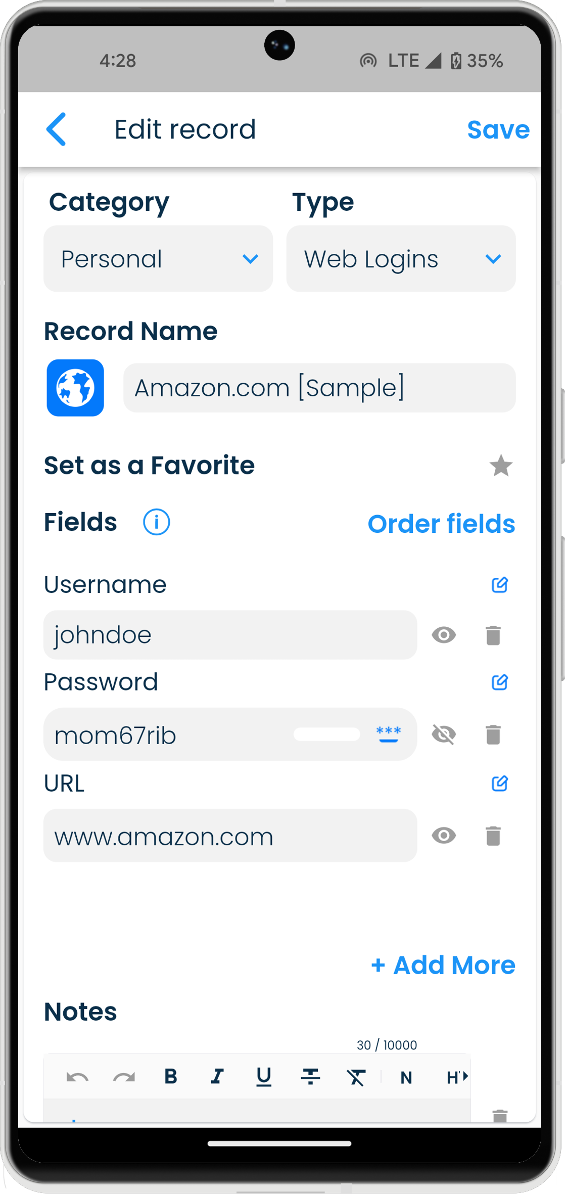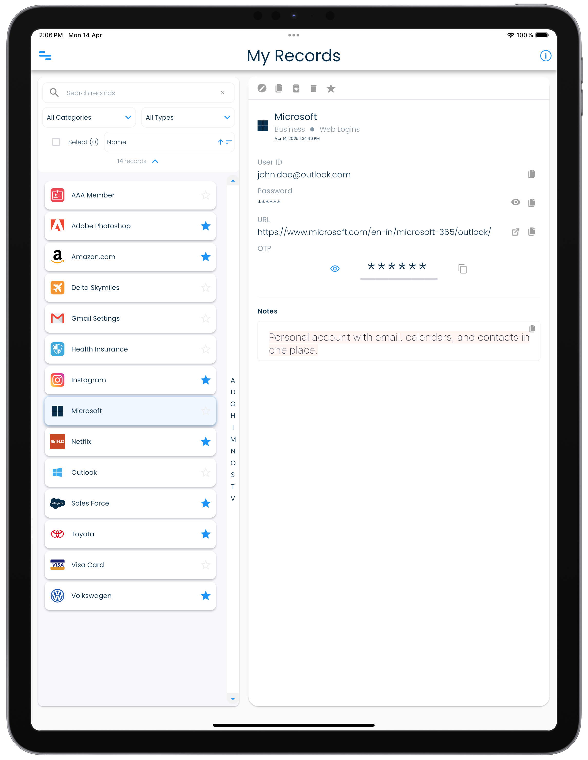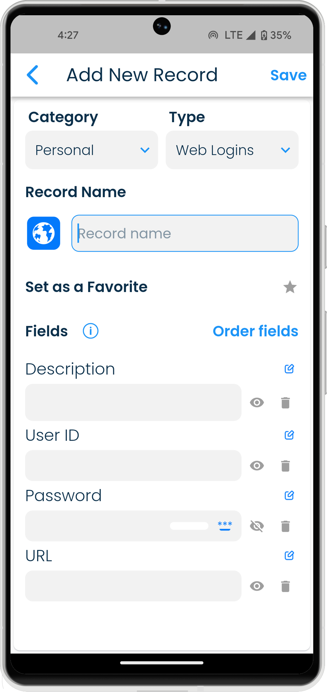 A record contains one or more fields that allow you to store information of different types. These can be simple text, pin codes, email addreses, web site addresses, OTP code generators, and passwords among others.