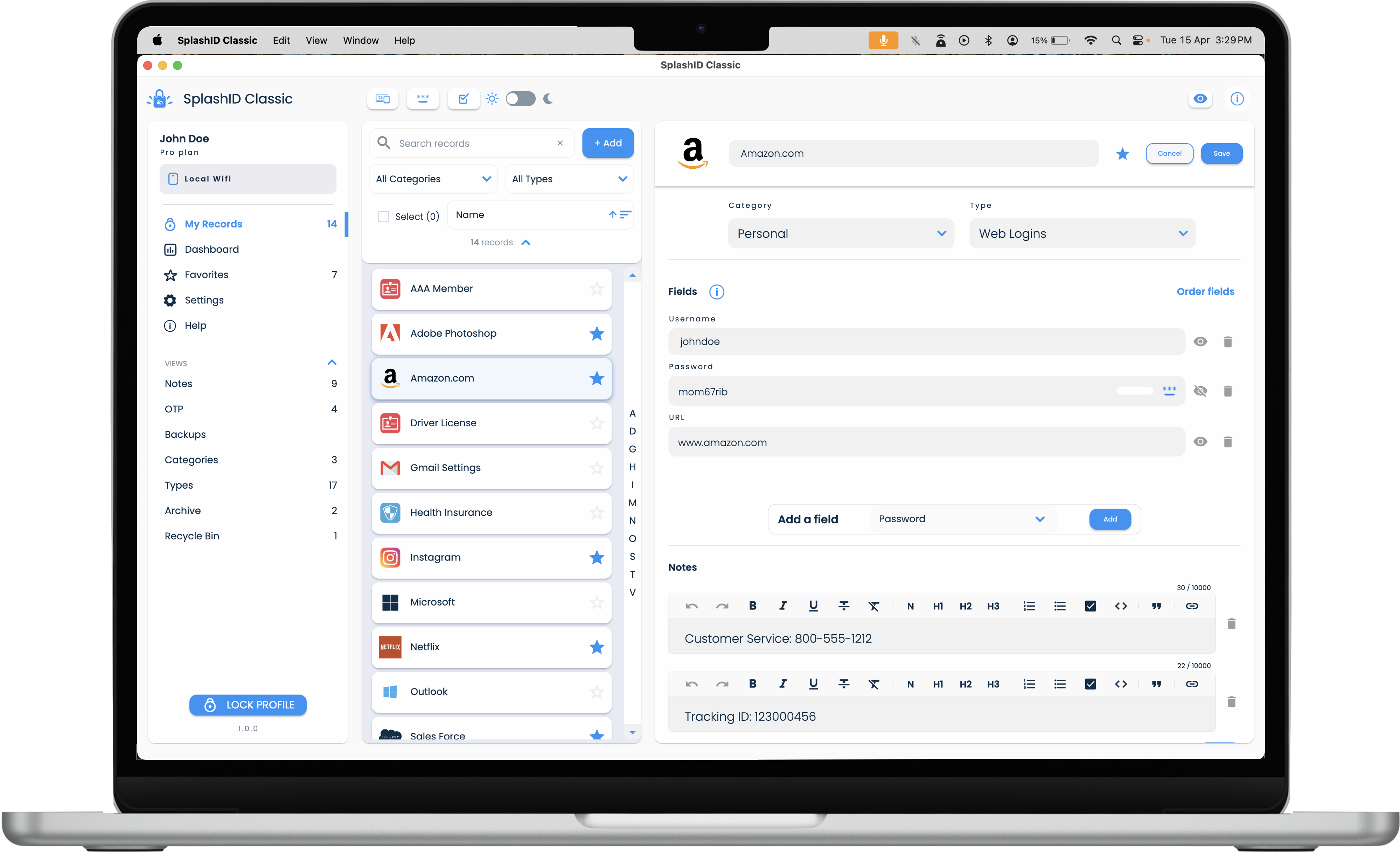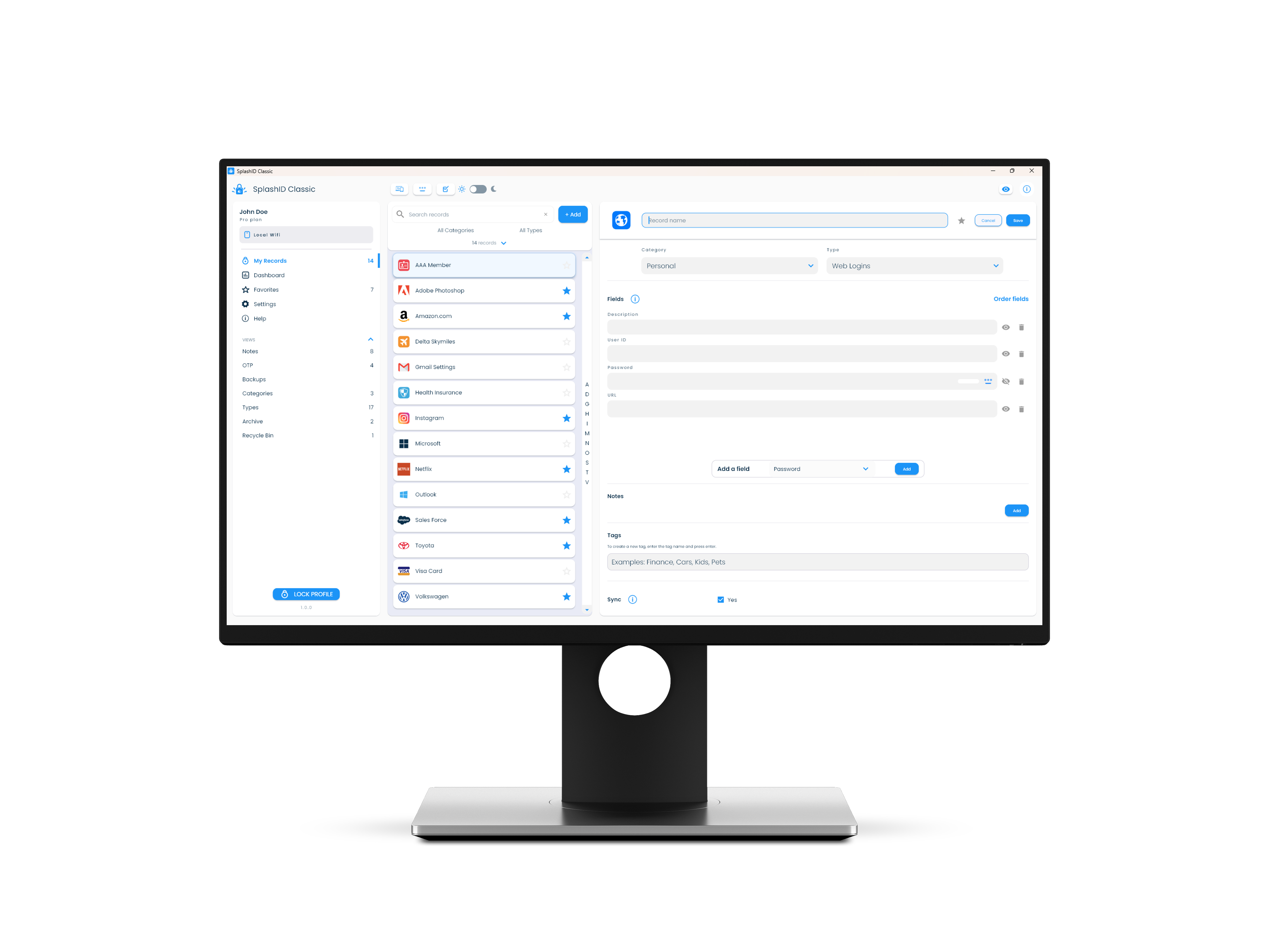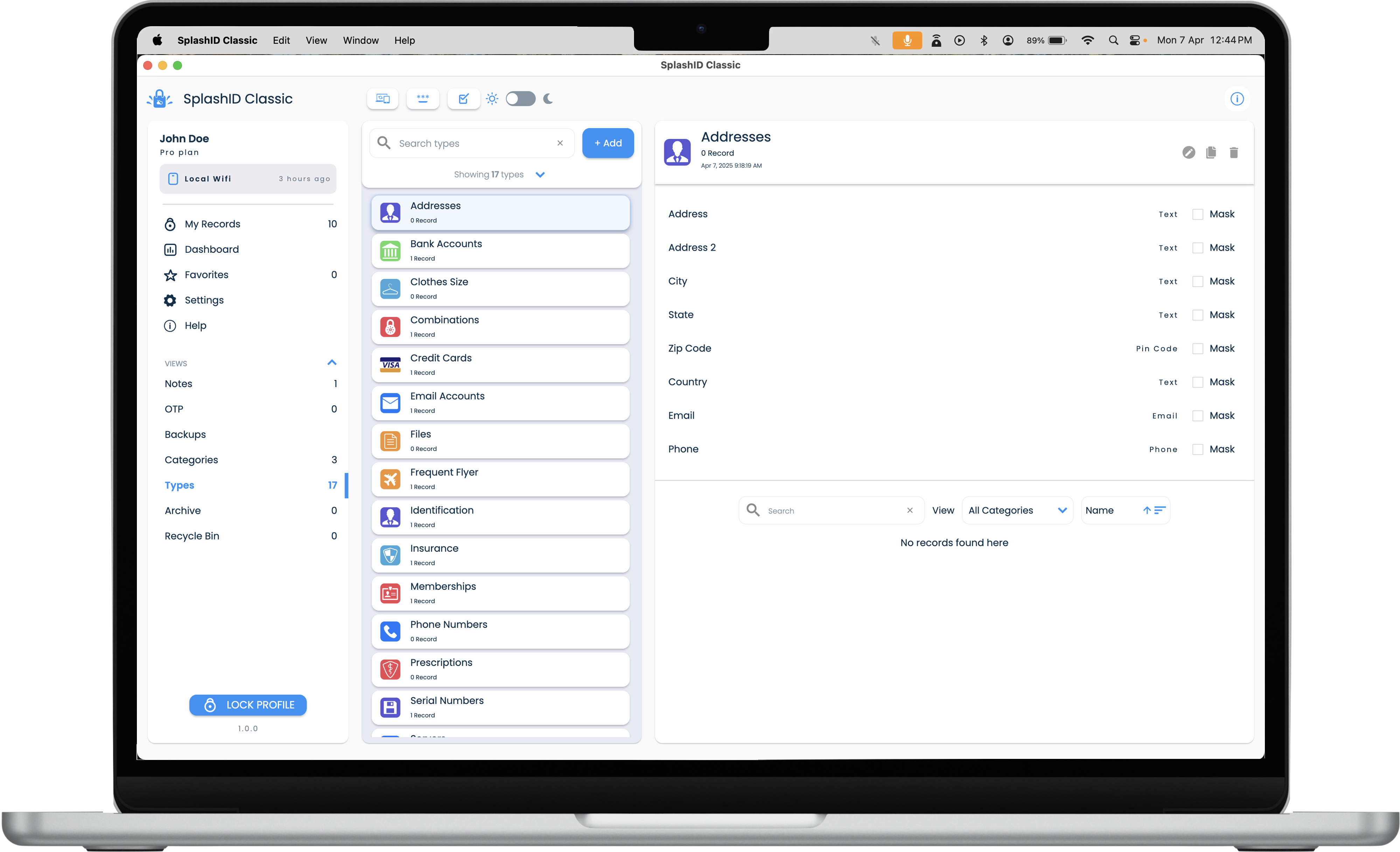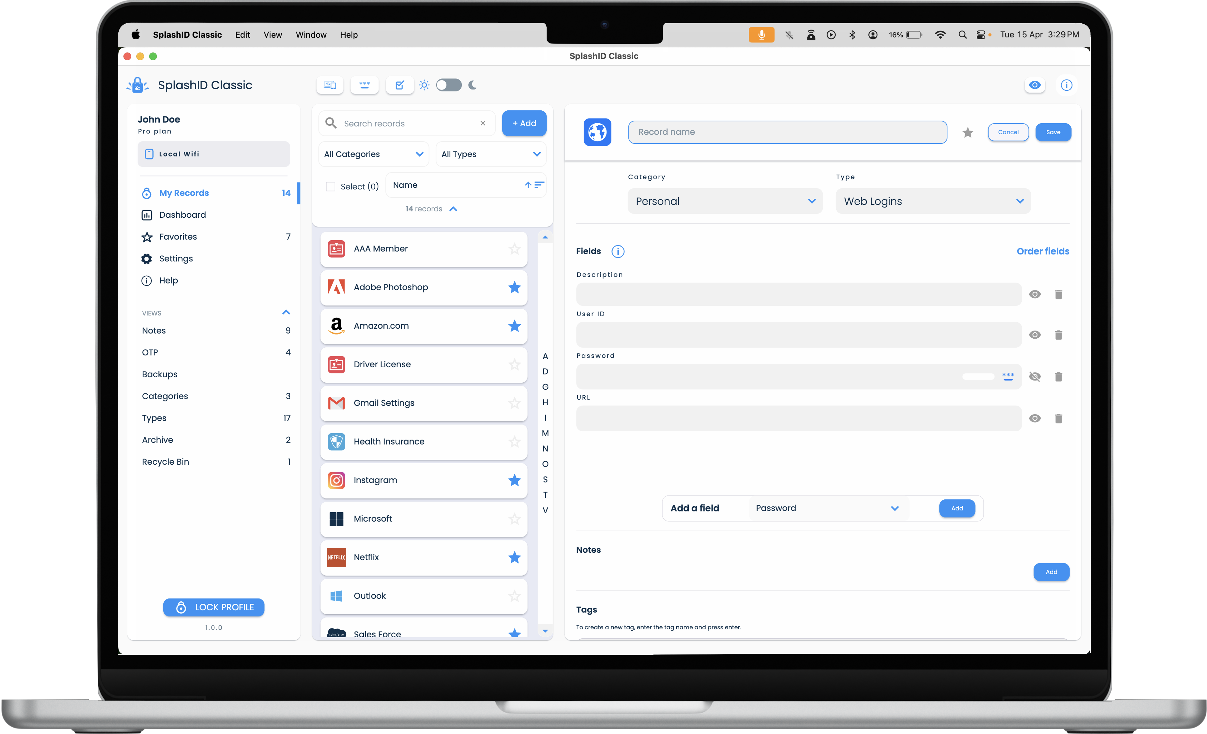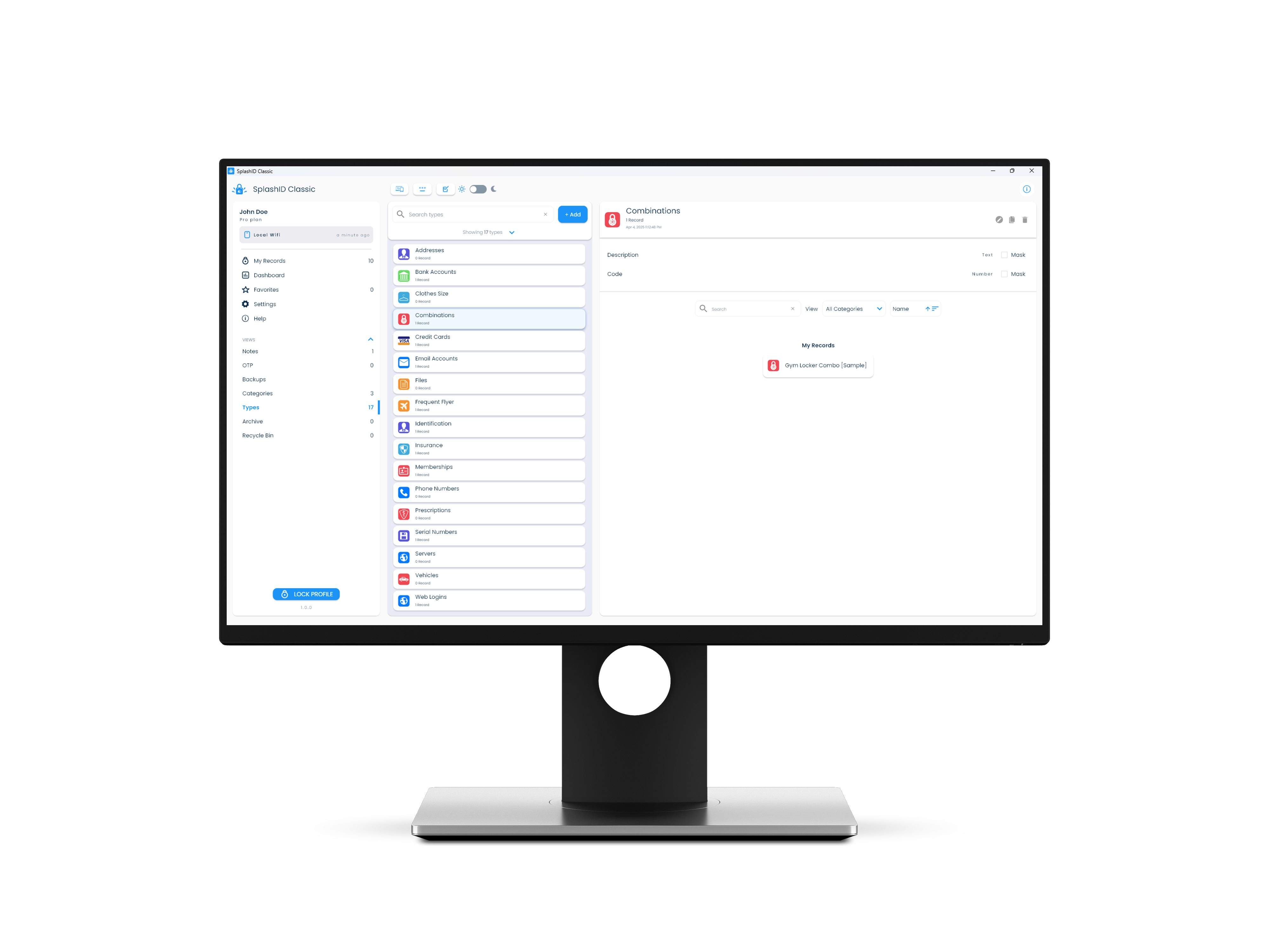 A record contains one or more fields that allow you to store information of different types. These can be simple text, pin codes, email addreses, web site addresses, OTP code generators, and passwords among others.