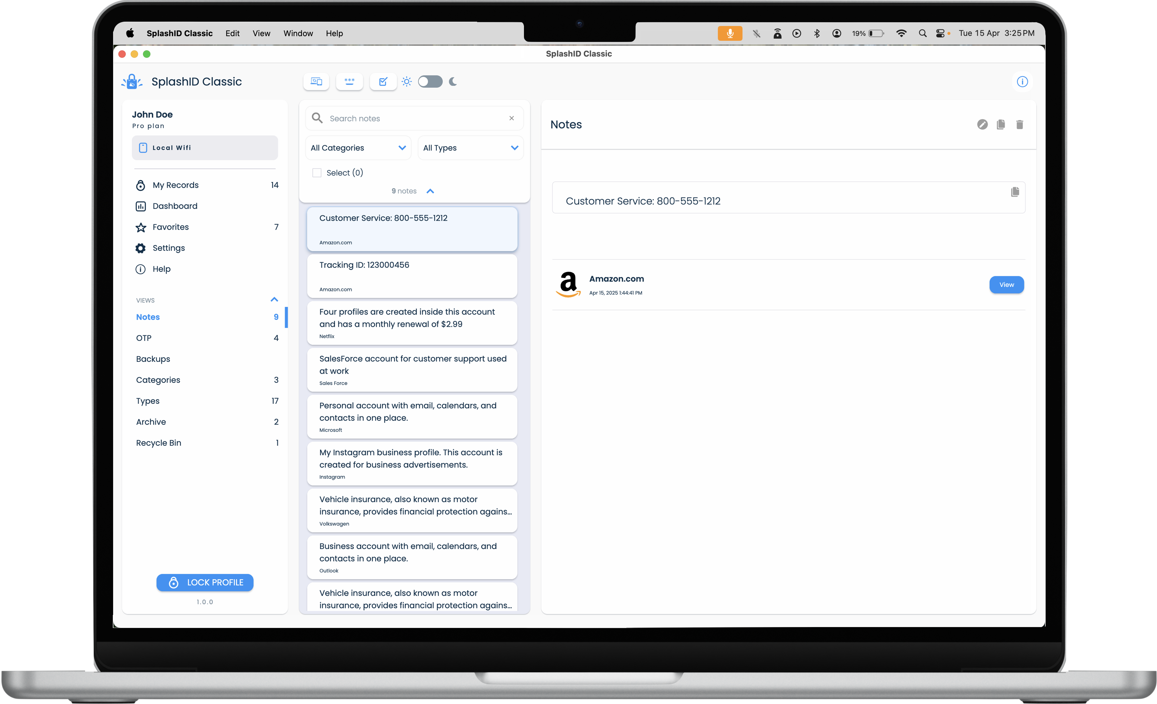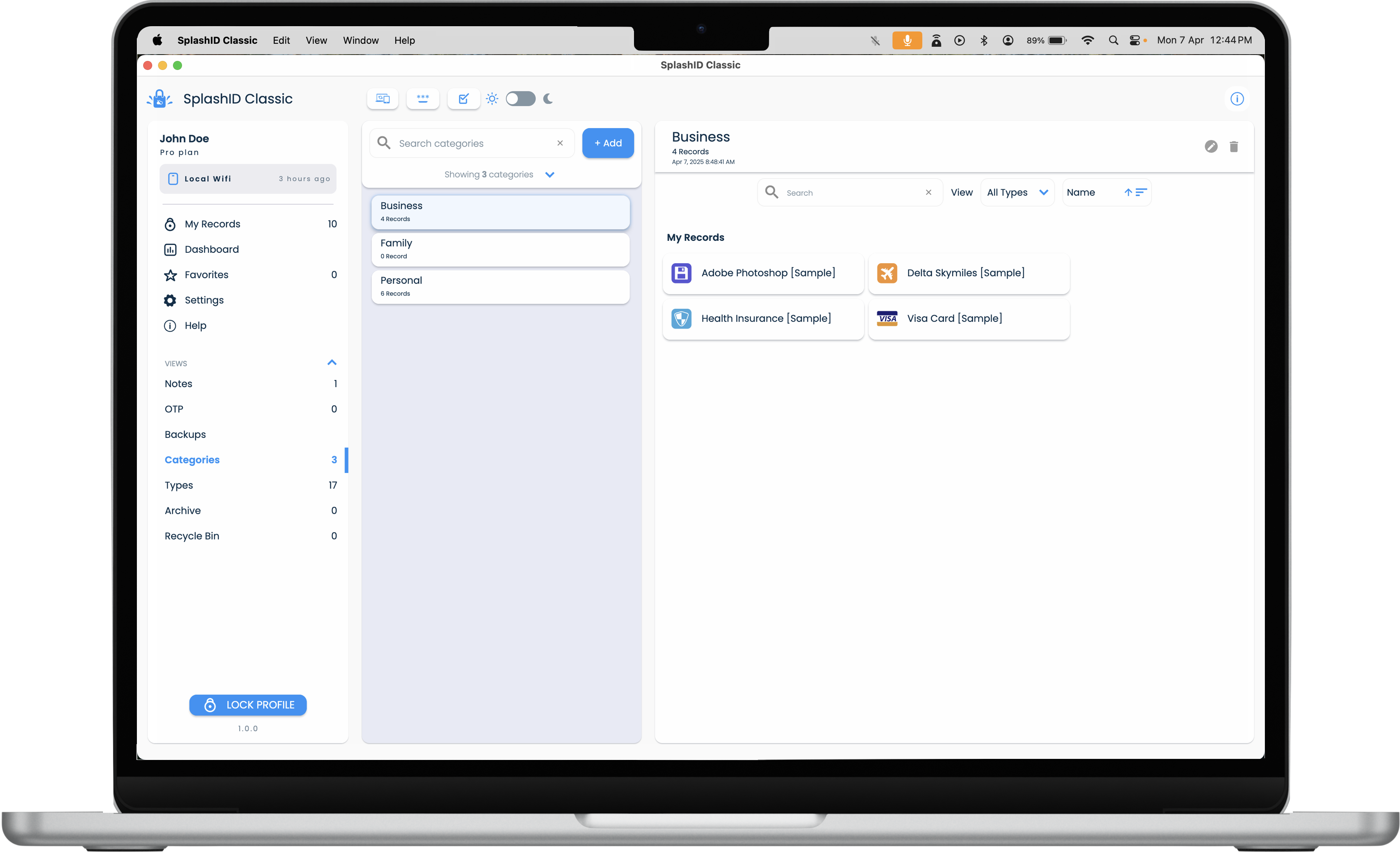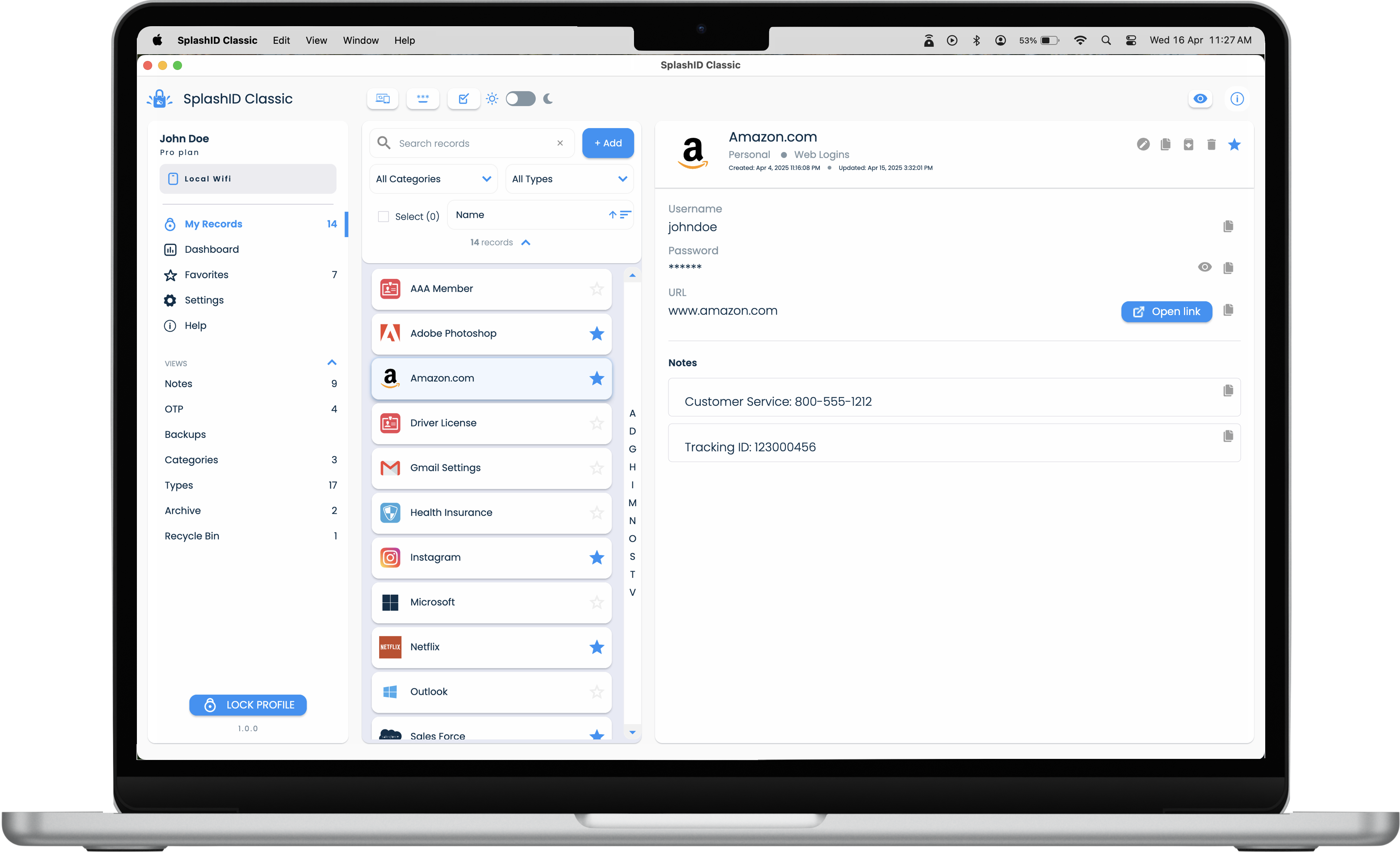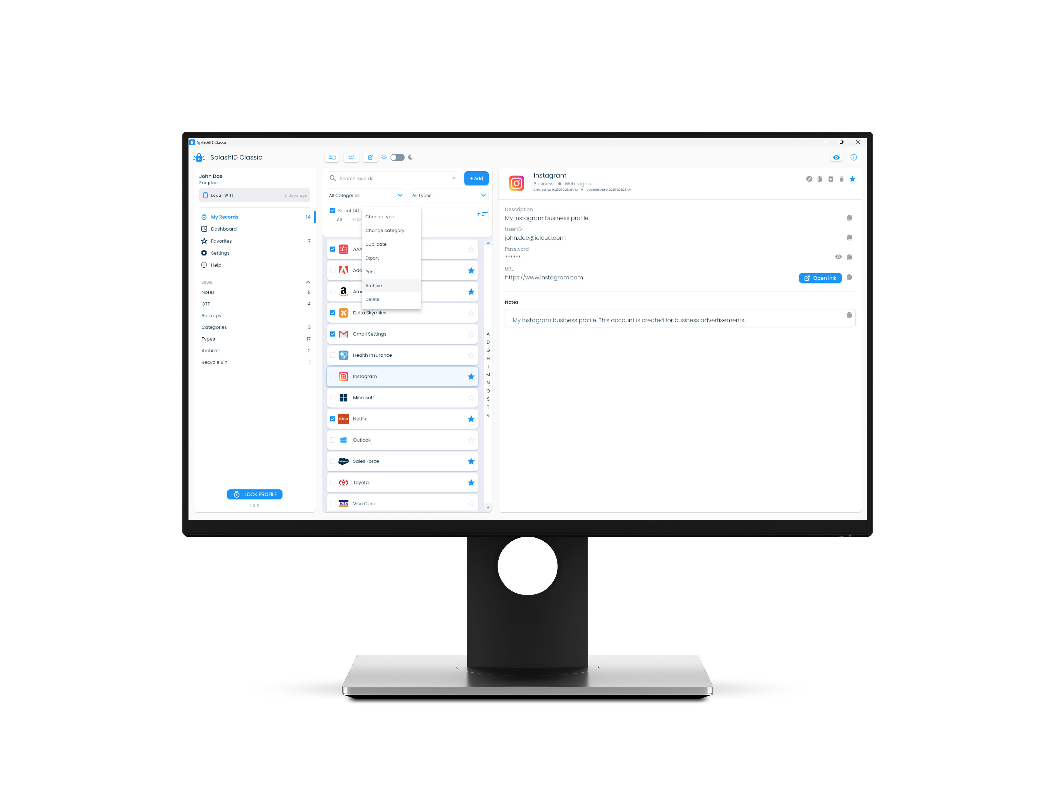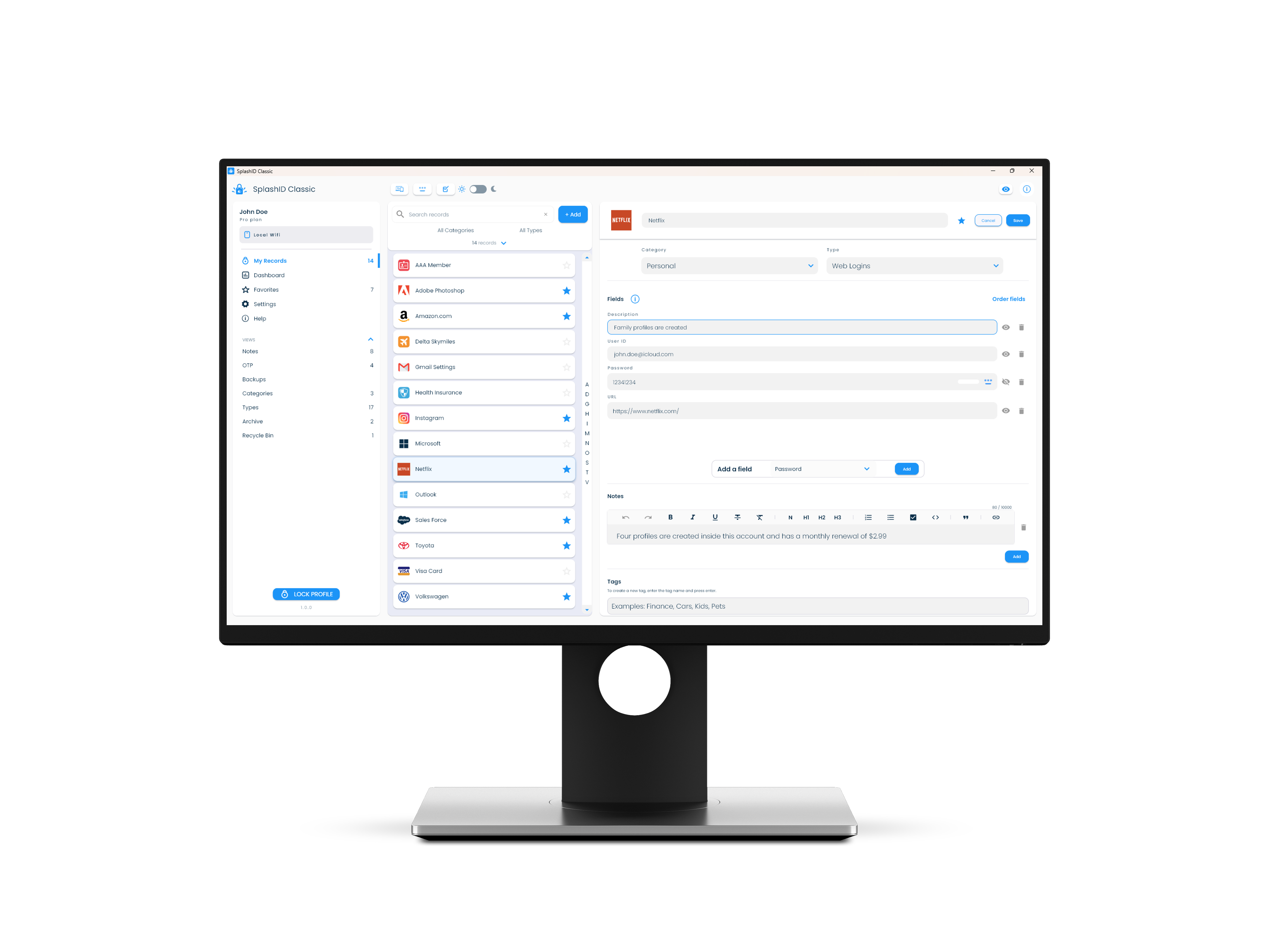 A record contains one or more fields that allow you to store information of different types. These can be simple text, pin codes, email addreses, web site addresses, OTP code generators, and passwords among others.