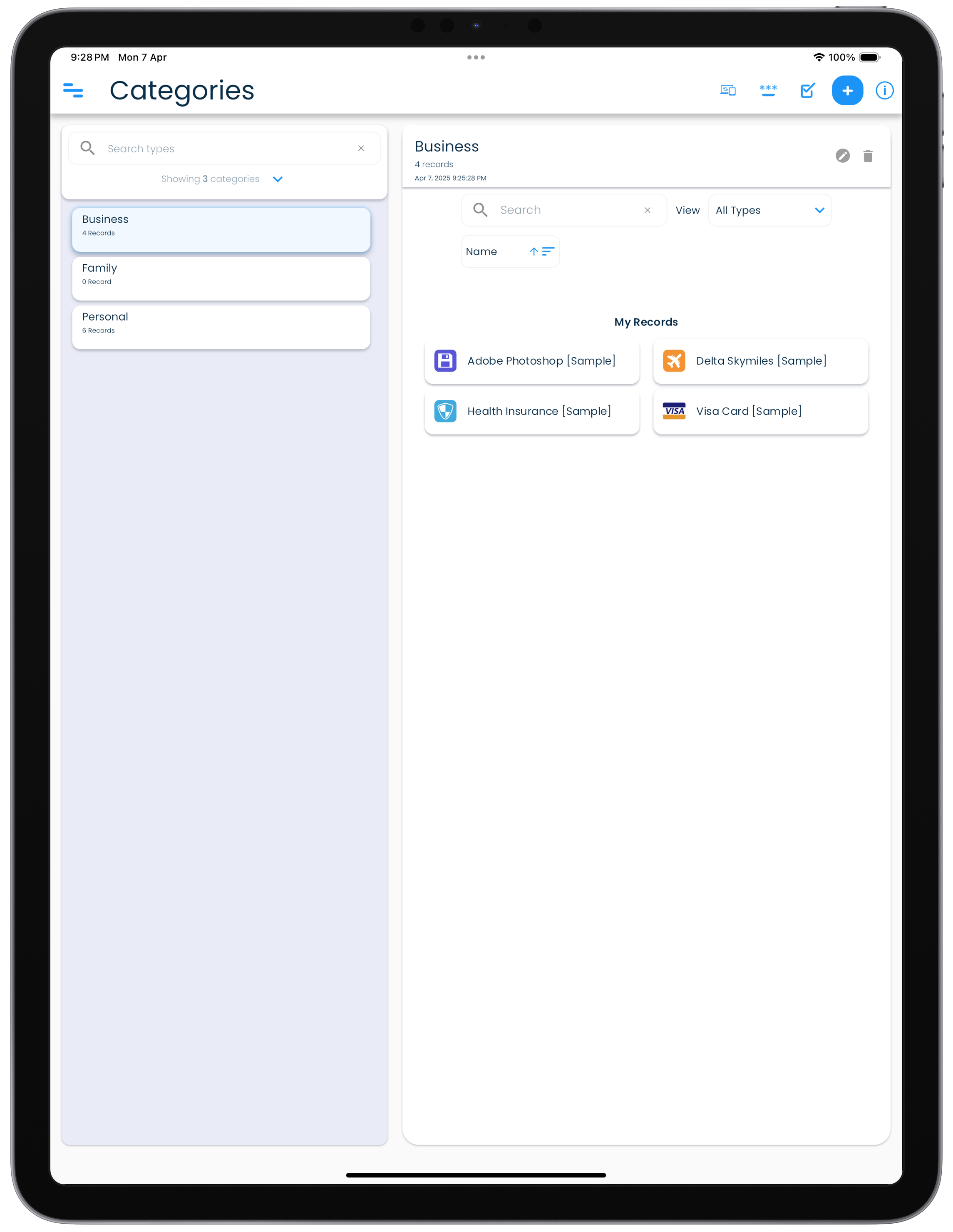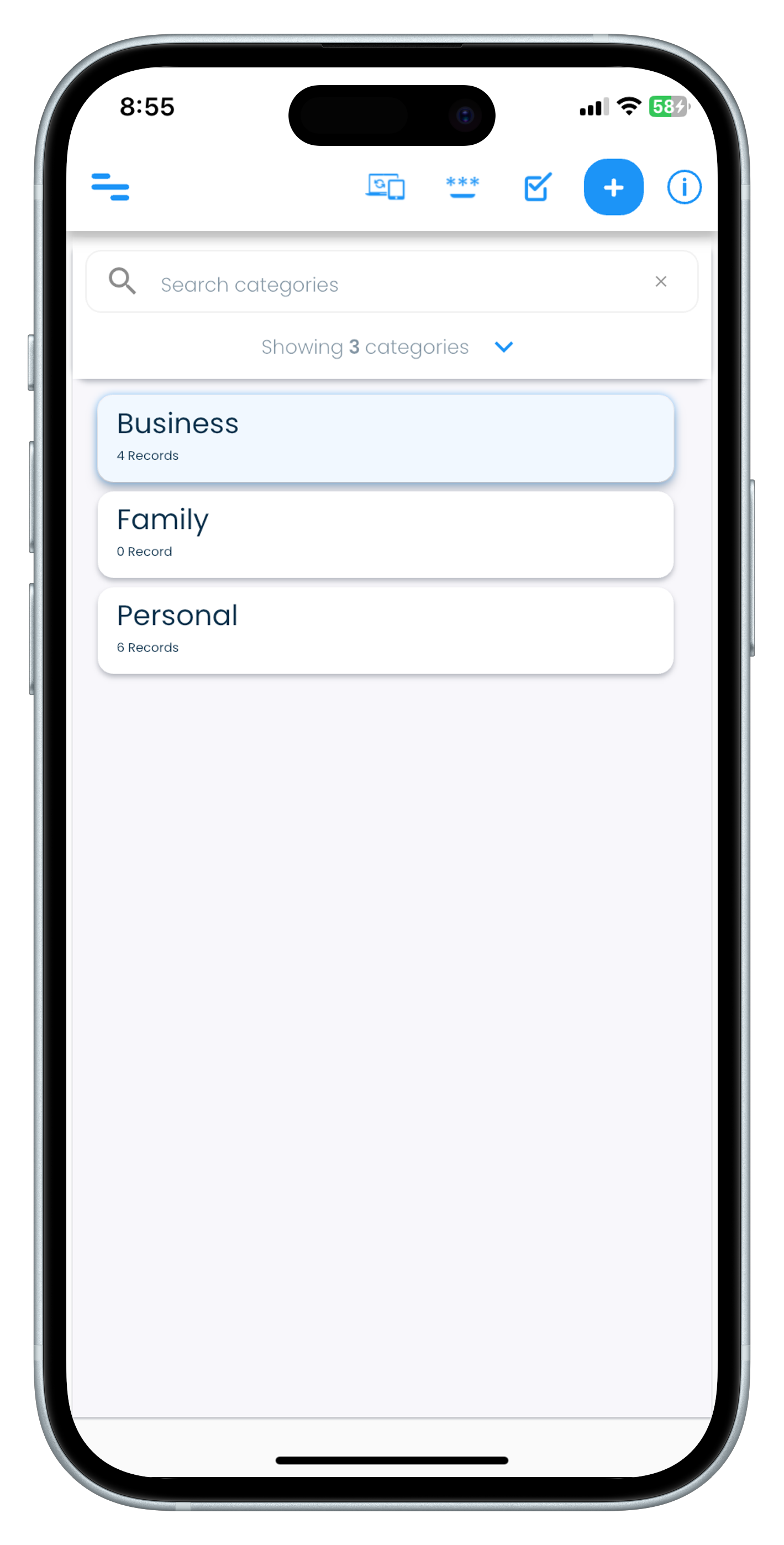 You can create any number of categories to help you organise your records in a folder like way. This can be done in the Categories screen.
