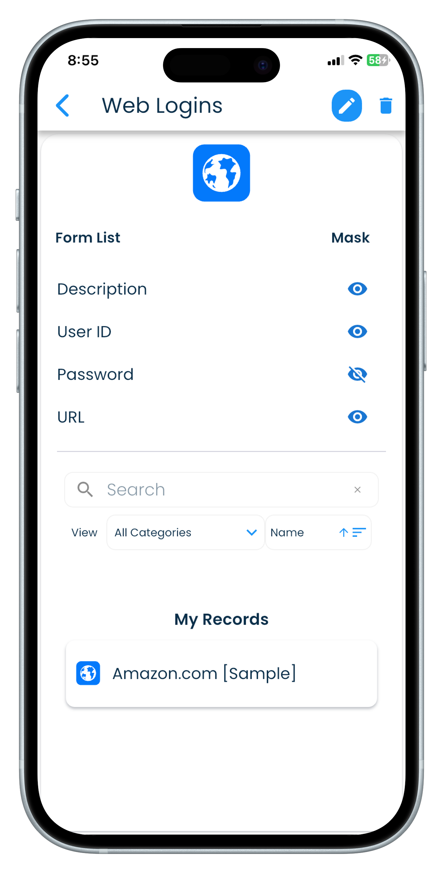 You can also mask any other fields that you want to. To do this, edit a record, and click or tap on the eye icon to the right of the field to mask or unmask it.