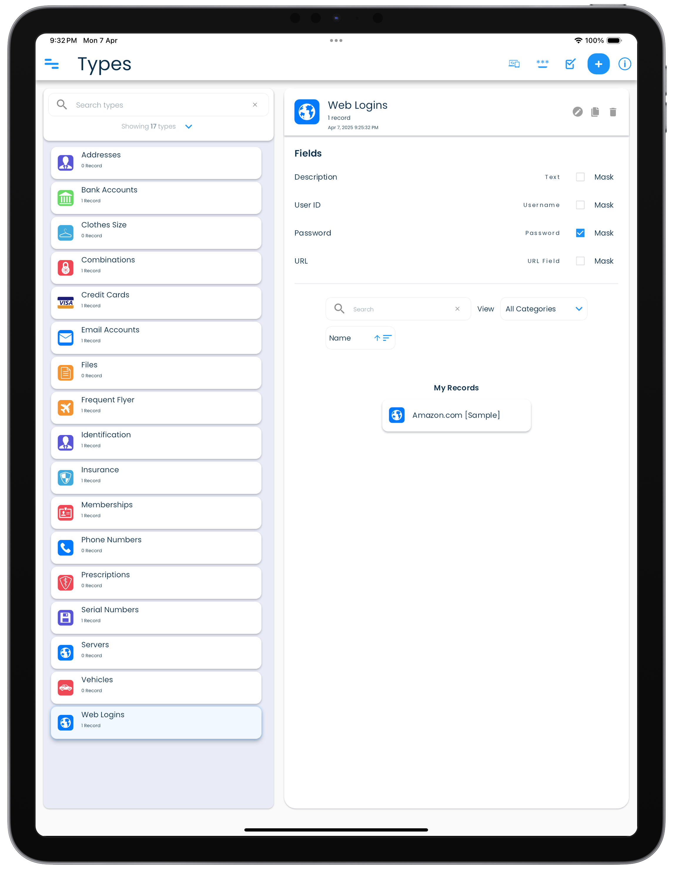 Each record belongs to a category and is of a particular type. Use categories and types to organise your records as you wish.